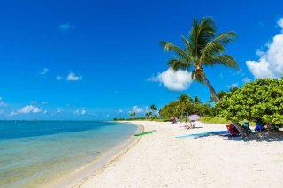 알록달록한 서핑보드, 야자수 파라솔, 빈백, 모래사장, 푸른 바다